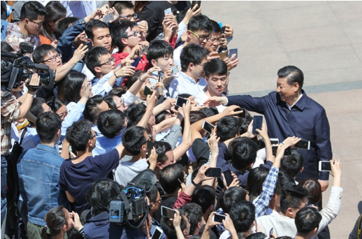2018年5月2日,中共中央總書記、國家主席、中央軍委主席習近平來到北京大學考察。這是習近平離開學校時同道路兩旁師生親切握手。新華社記者 王曄攝