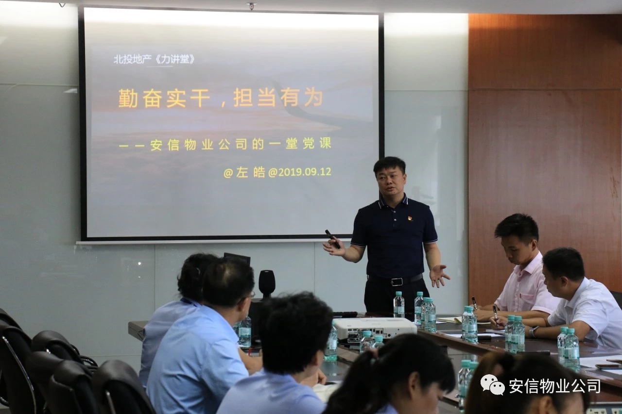 在安信物業(yè)公司黨支部召開“不忘初心 牢記使命”專題組織生活會上。公司黨委書記、董事長左皓給與會黨員上了一堂“勤奮實干、擔(dān)當(dāng)有為”為主題的黨課。