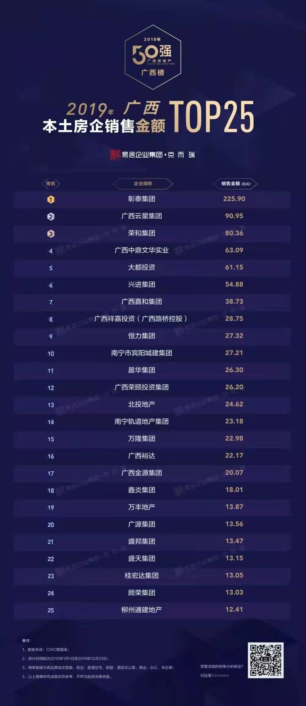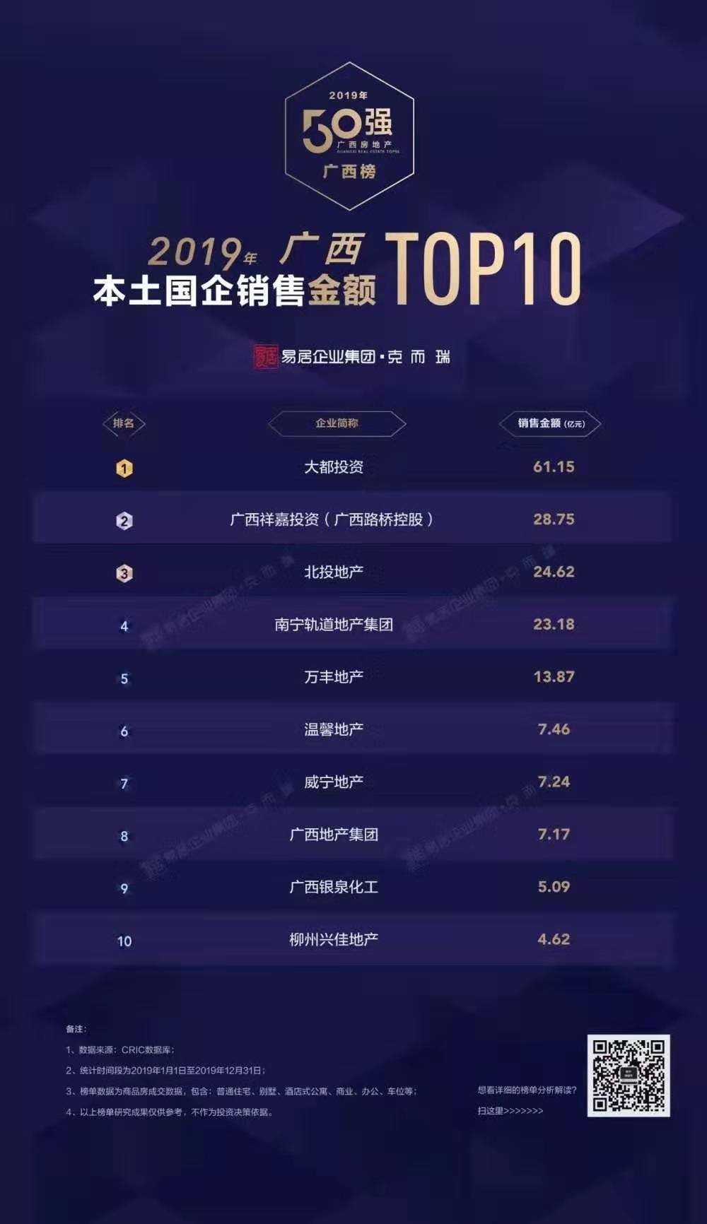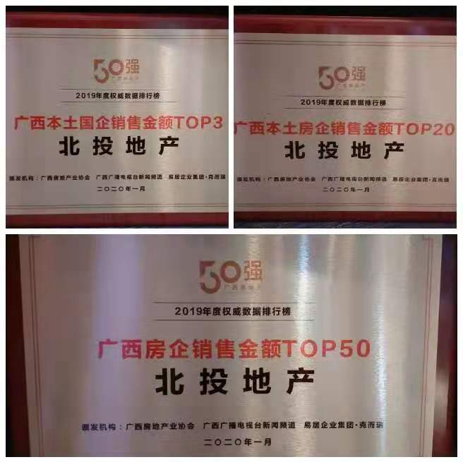 在2020年1月9日舉辦的“2019廣西房地產行業盛典暨市場數據排行榜發布會”上,北投地產斬獲3項榮譽:“廣西本土國企銷售金額TOP3”、“廣西本土房企銷售金額TOP20”、“廣西房企銷售金額TOP50”,新晉廣西地產業50強。易居企業集團·克而瑞發布的數據顯示,北投地產2019年實現銷售金額24.62億元,排行2019年廣西房企銷售金額第33位、廣西本土國企銷售金額第3位。