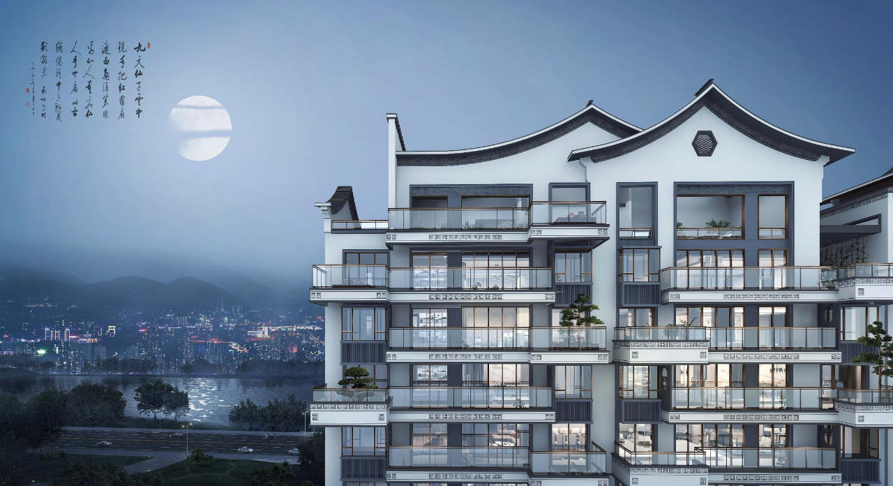 在設計上,講究中國傳統的建筑美學。從中國南方傳統建筑中提取經典的元素和符號,并與現代建筑融會貫通,打造獨有“荷風美學”的迭代作品。比如屋檐以經典人字形來造型,建筑用灰白線條勾勒,同時又在灰色的屋頂和挑檐中間采用白色凹槽間隔,形成“灰夾白”的效果,美感十足。另外,合院側面造型猶如國畫中的院落,充滿詩意;小高層側面是帶有弧度的人形頂,與質感十足的陽臺金色綬帶和玻璃欄桿相映襯,達到了傳統元素與現代建筑的完美結合;花窗、窗欞、印章等元素符號在其中點綴,更是韻味十足。