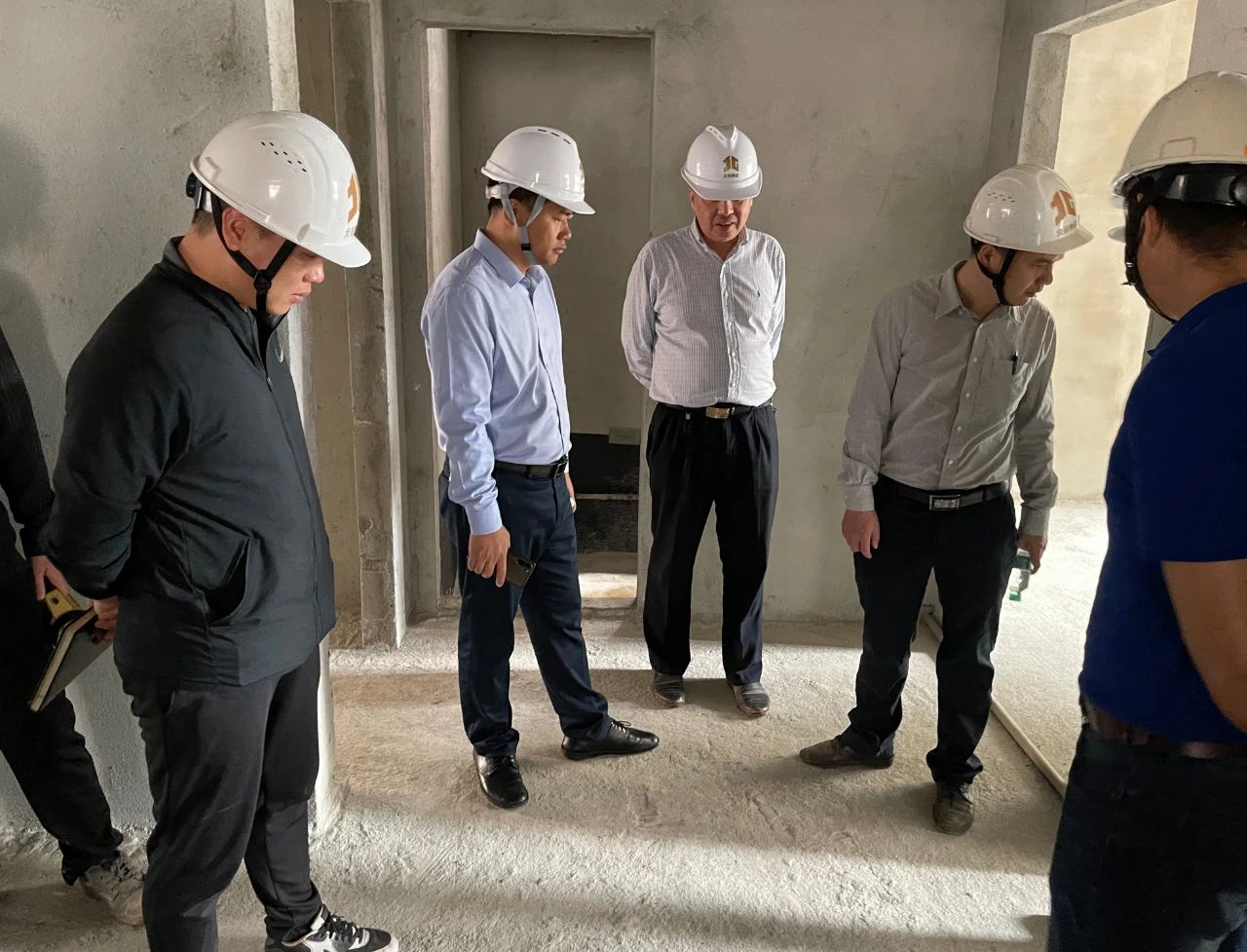 當天上午,吳富勇率集團公司工程管理部及各項目相關負責人到南寧五象智慧健康城項目開展現場學習,觀看了項目地下室管線布置的情況、防水工程的施工工藝、準備交付的地下室的情況、準備交付樓棟的施工情況,并在現場開展了施工管理經驗及管理痛點交流分享。