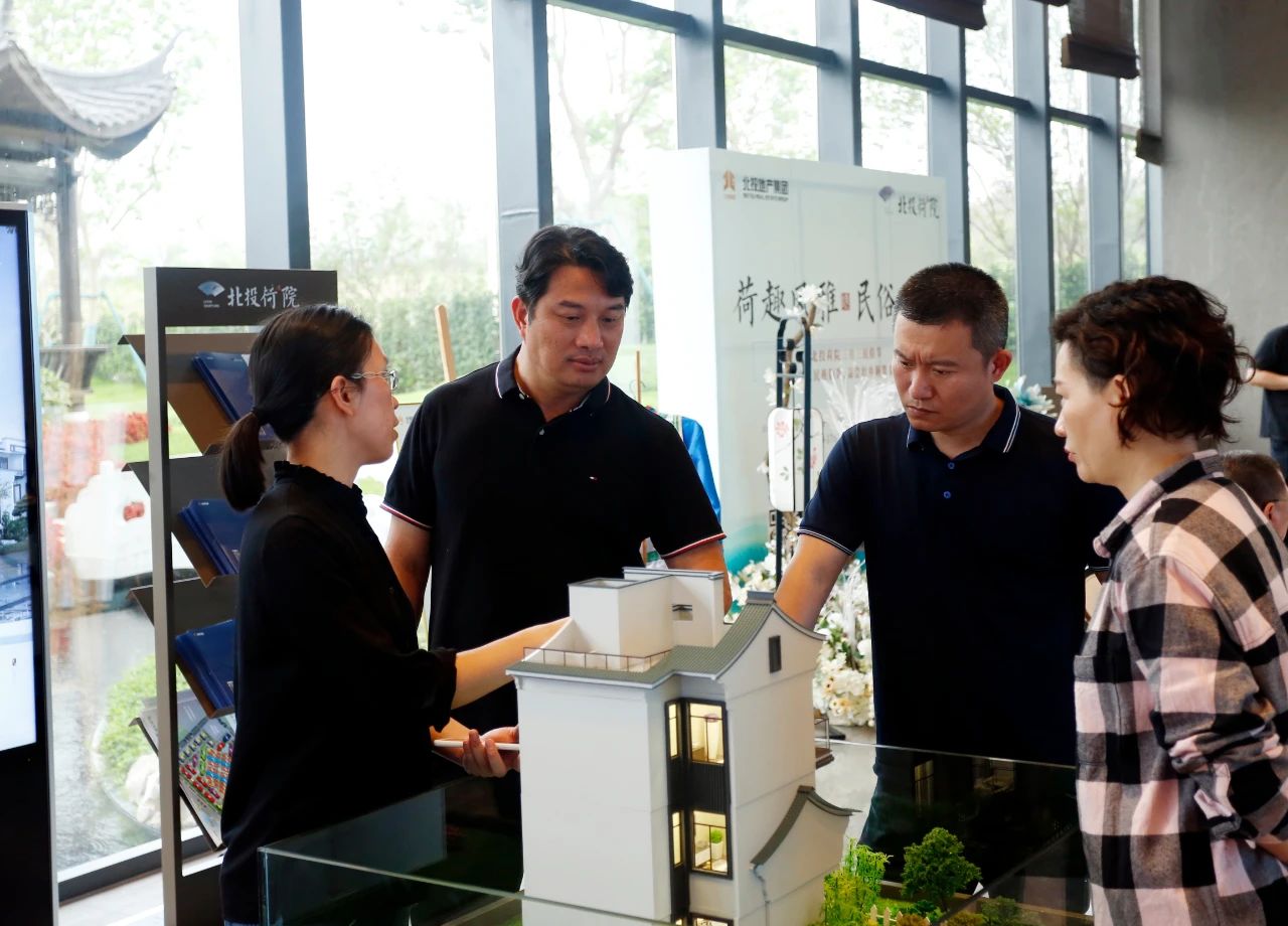挖掘機、推土機、運輸車……北投荷院項目施工現場車輛穿梭,機器轟鳴,一片繁忙景象,多樓棟主體結構已完成封頂。項目營銷中心推出壯族服飾體驗、壯鄉簸箕宴、油紙傘手作等“三月三”民俗文化活動,吸引了眾多客戶到訪,置業顧問熱情向客戶介紹項目情況,現場熱鬧非凡。