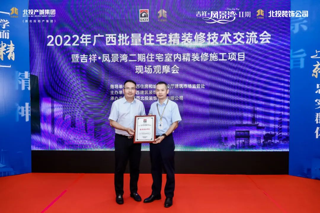 在廣西建筑裝飾協會的支持下,北投裝飾公司承辦本次活動,邀請國內住宅批量精裝方面具有豐富施工經驗的知名企業專家前來交流分享,為廣西批量精裝修技術的發展和技術革新提供高質量交流平臺。北投裝飾公司獲廣西建筑裝飾協會評為活動優秀承辦單位。